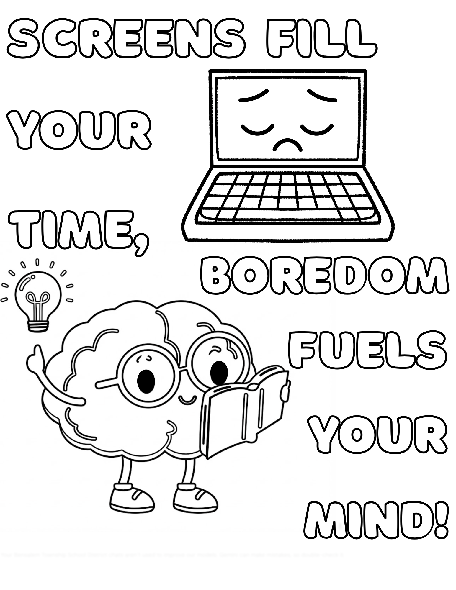 Instill a mantra as a family: Screens fill your time, boredom fuels your mind, Don’t drown the daydream, let your mind wander so it doesn’t get lost. (see coloring page)