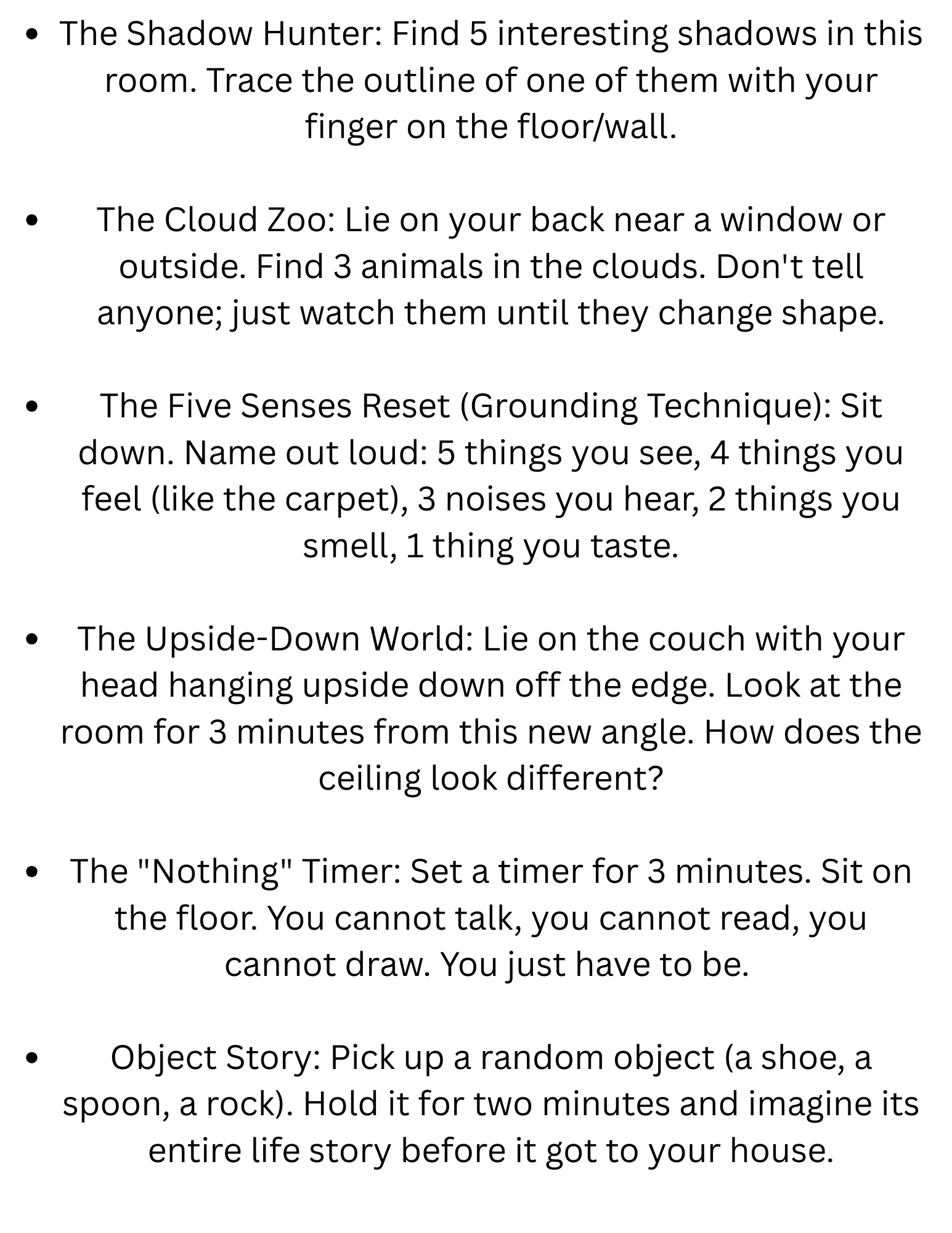 Normalize day dreaming moments - bring back staring out the window or up at the ceiling.
